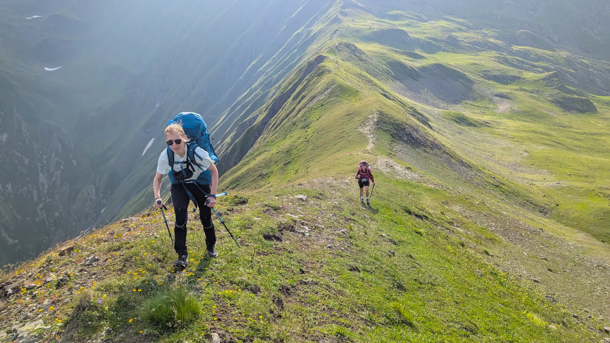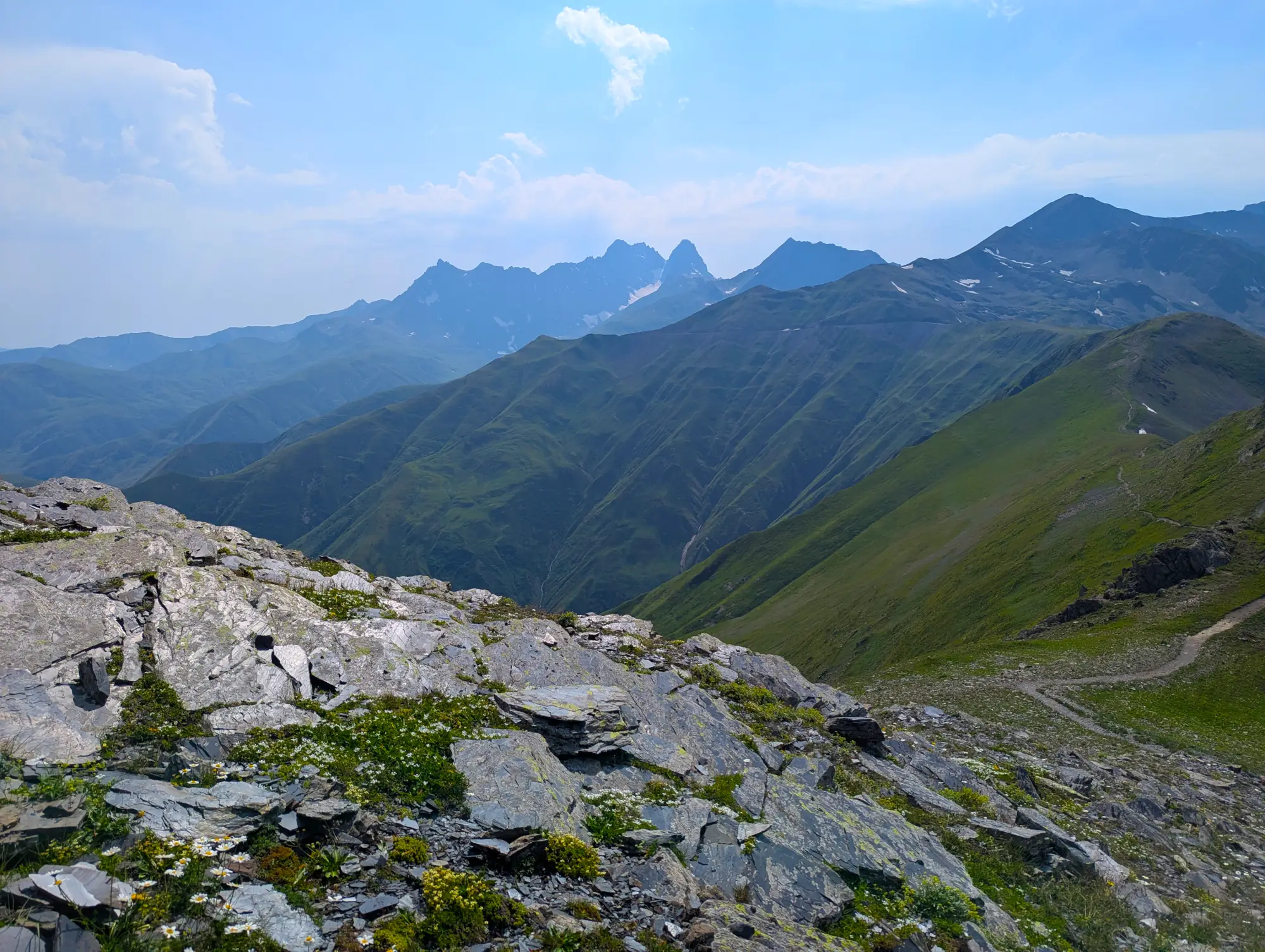 Дистанция / набор / сброс: ~12 км / ↑900 м / ↓770 м Описание тропы: едем в Хевсурети и начинаем трек на высоте (ориентир — хребет горы Архоти, выше Рошки). Идём в сторону долины Тание. К вечеру выходим к видовому приюту на краю хребта.