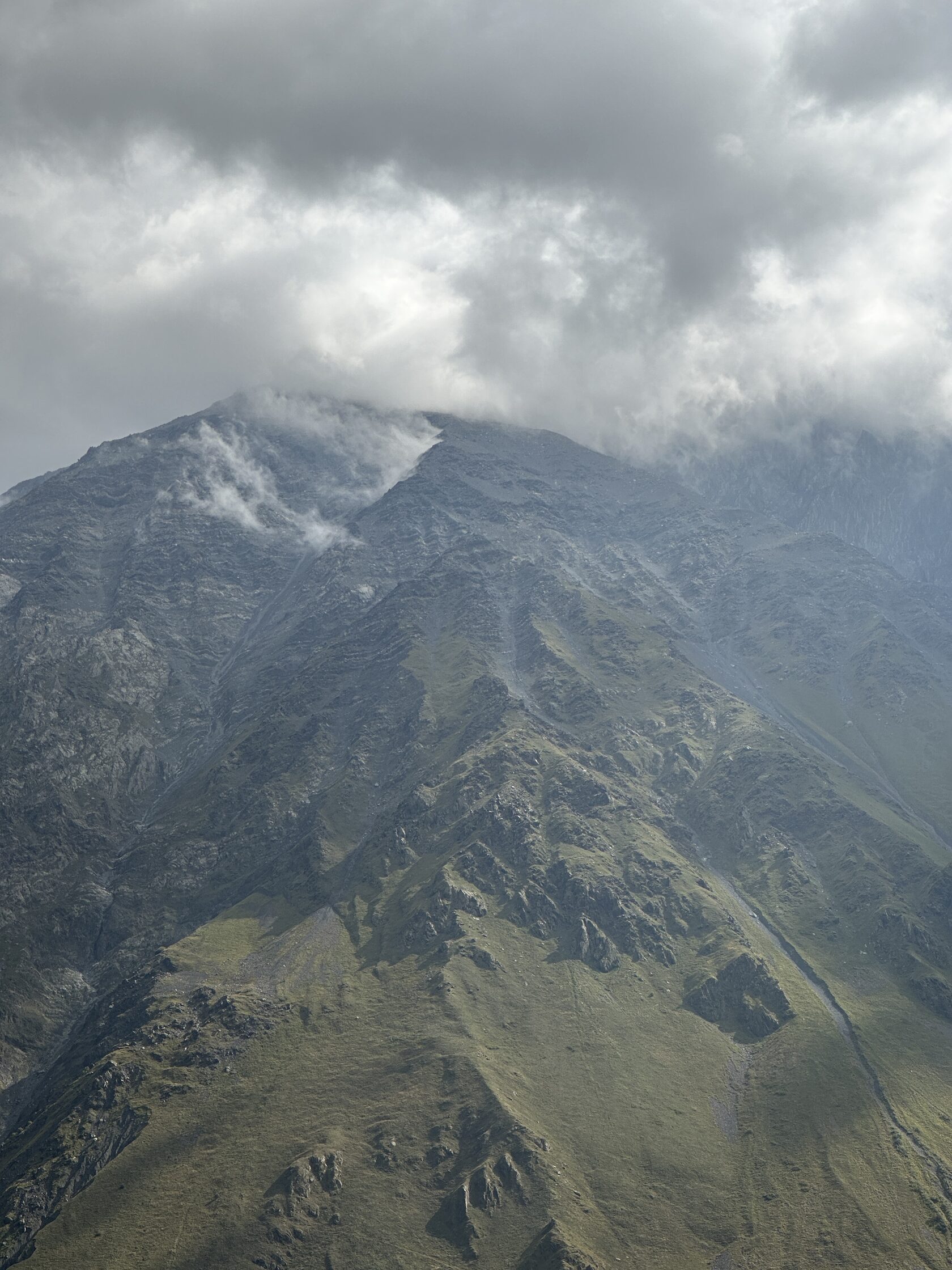 As you gain elevation, the trail reveals more of the rugged Caucasus landscape — behind you, the Gergeti Church and village fade away, while ahead lie rocky slopes and breathtaking mountain panoramas.