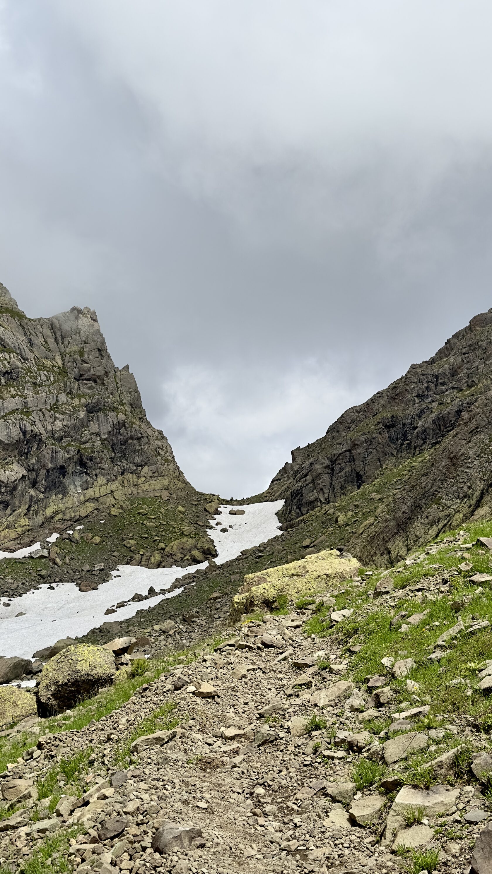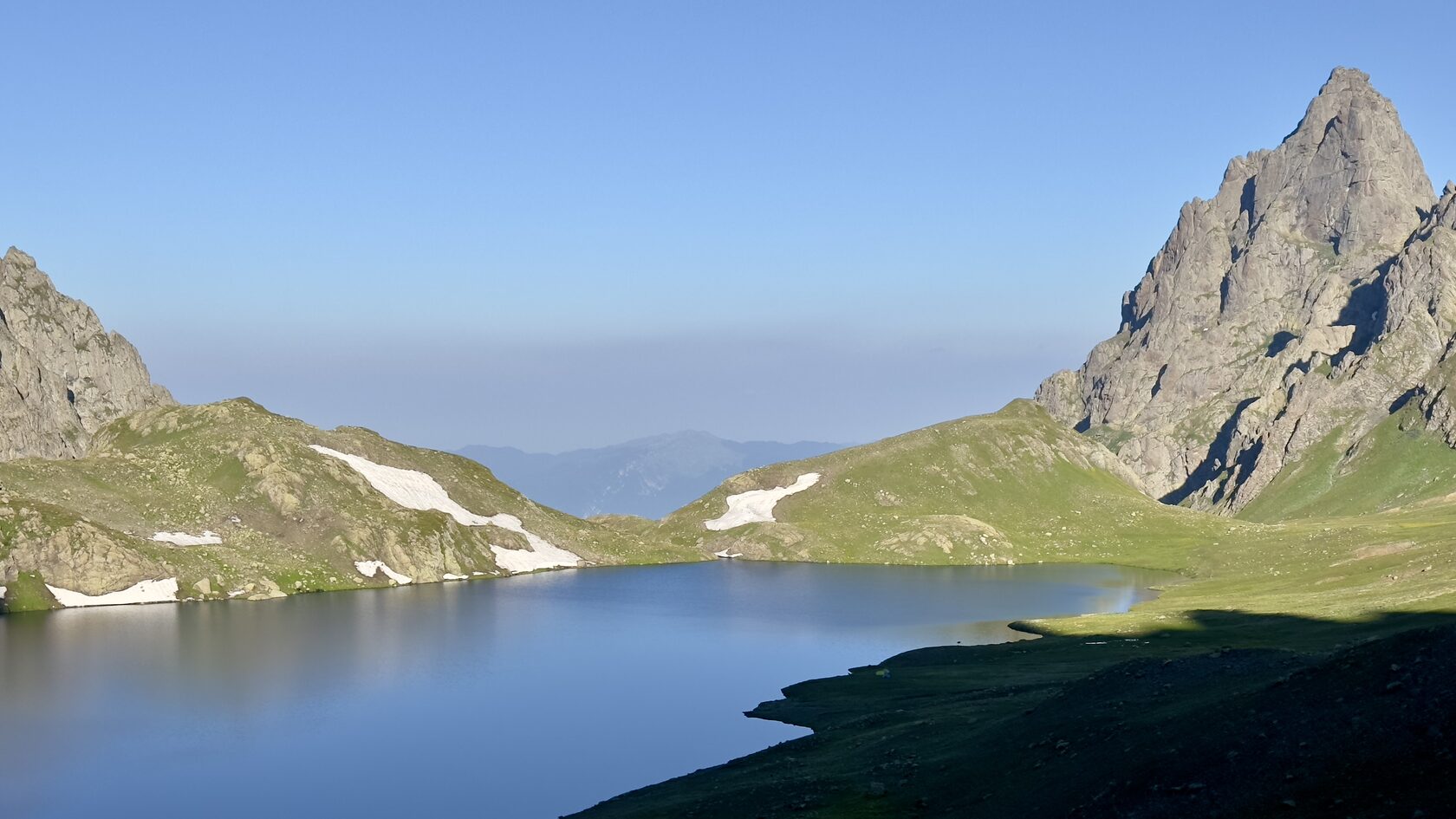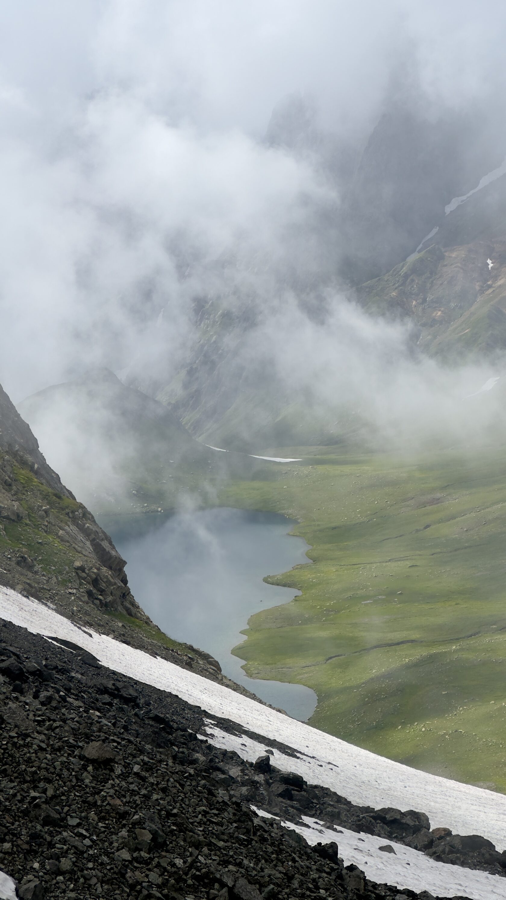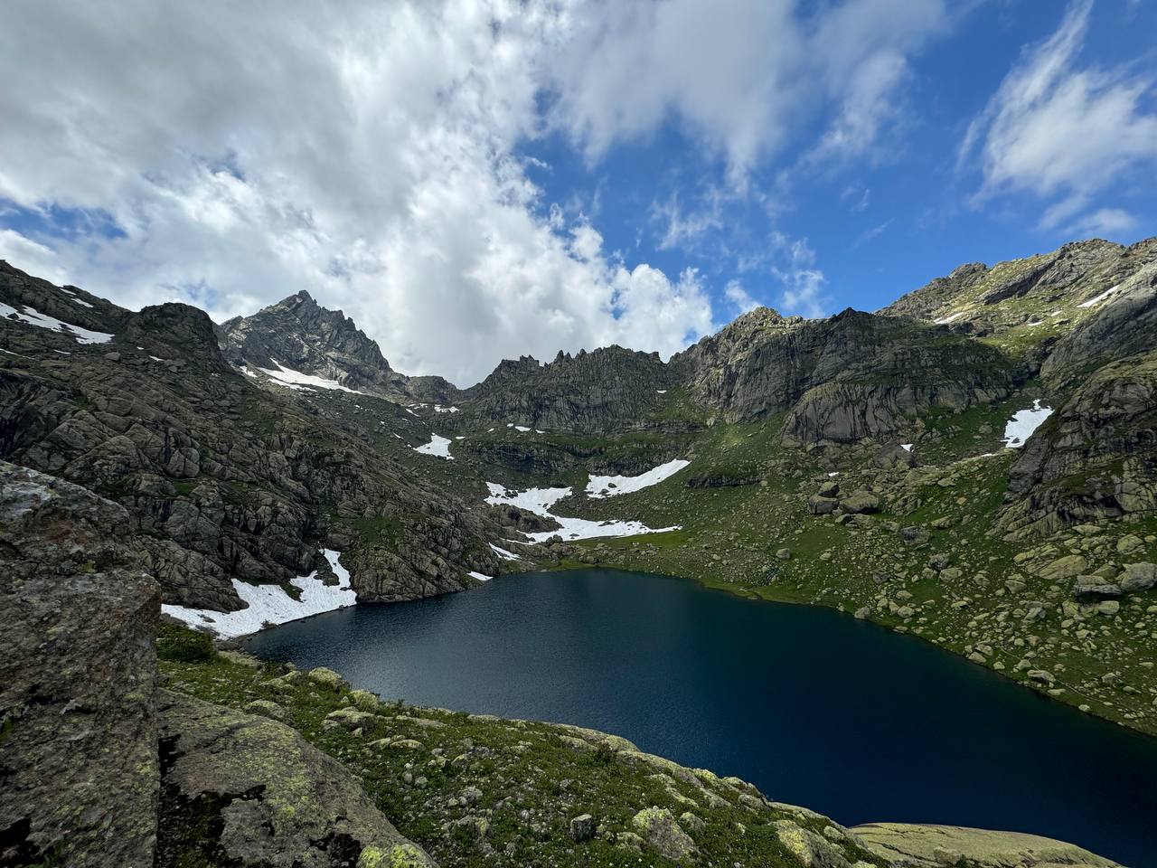 The descent to the lake offers diverse terrain—rocky sections and snowfields. Upon reaching the lake, we’ll set up camp, unwind, and immerse ourselves in the pristine beauty of the surroundings.